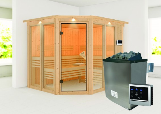 Karibu Design Sauna "Sauna Ainur" 5 Personen 9 kW Ofen (finnisch) + Steuergerät mit Dachkranz