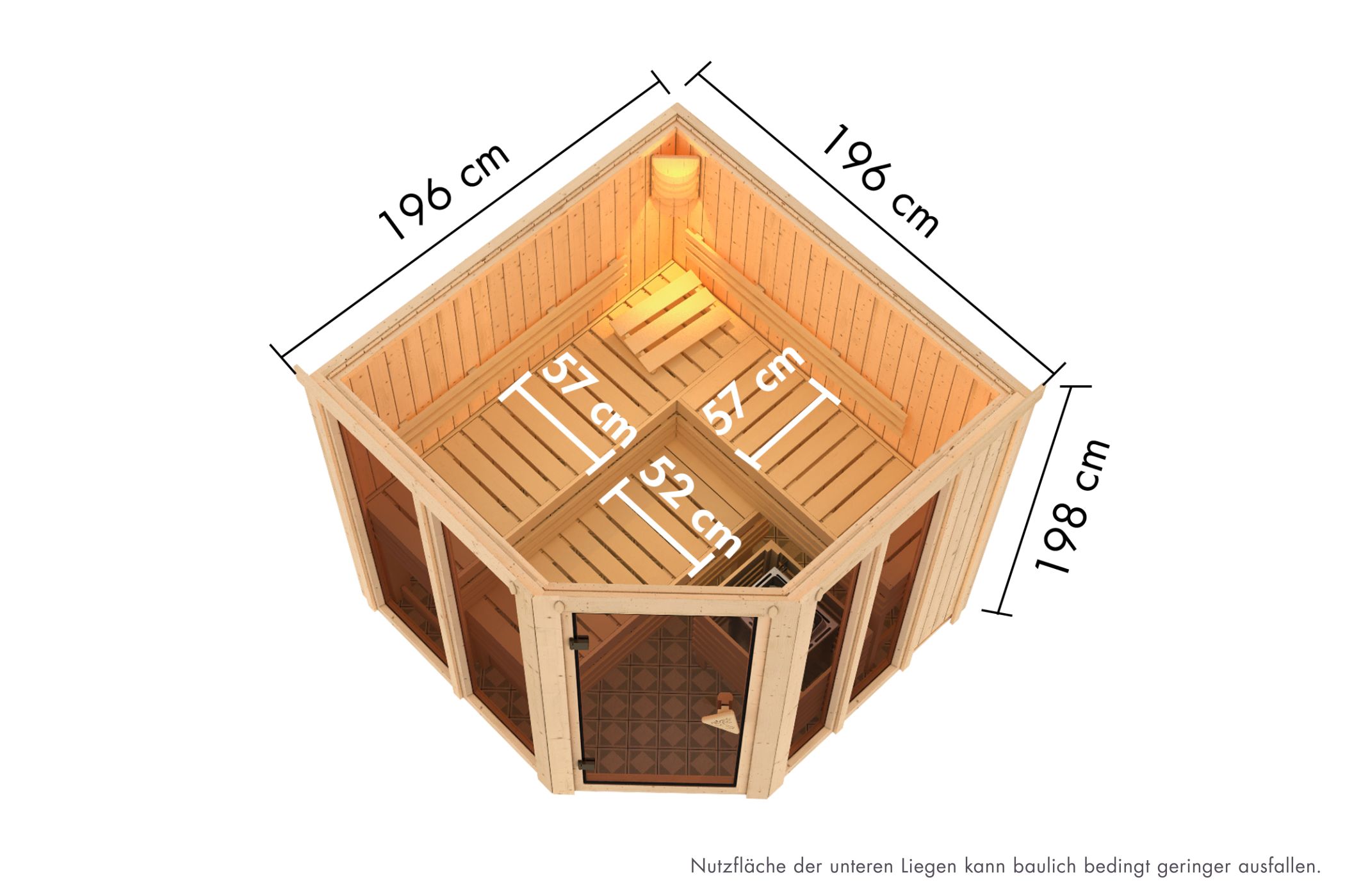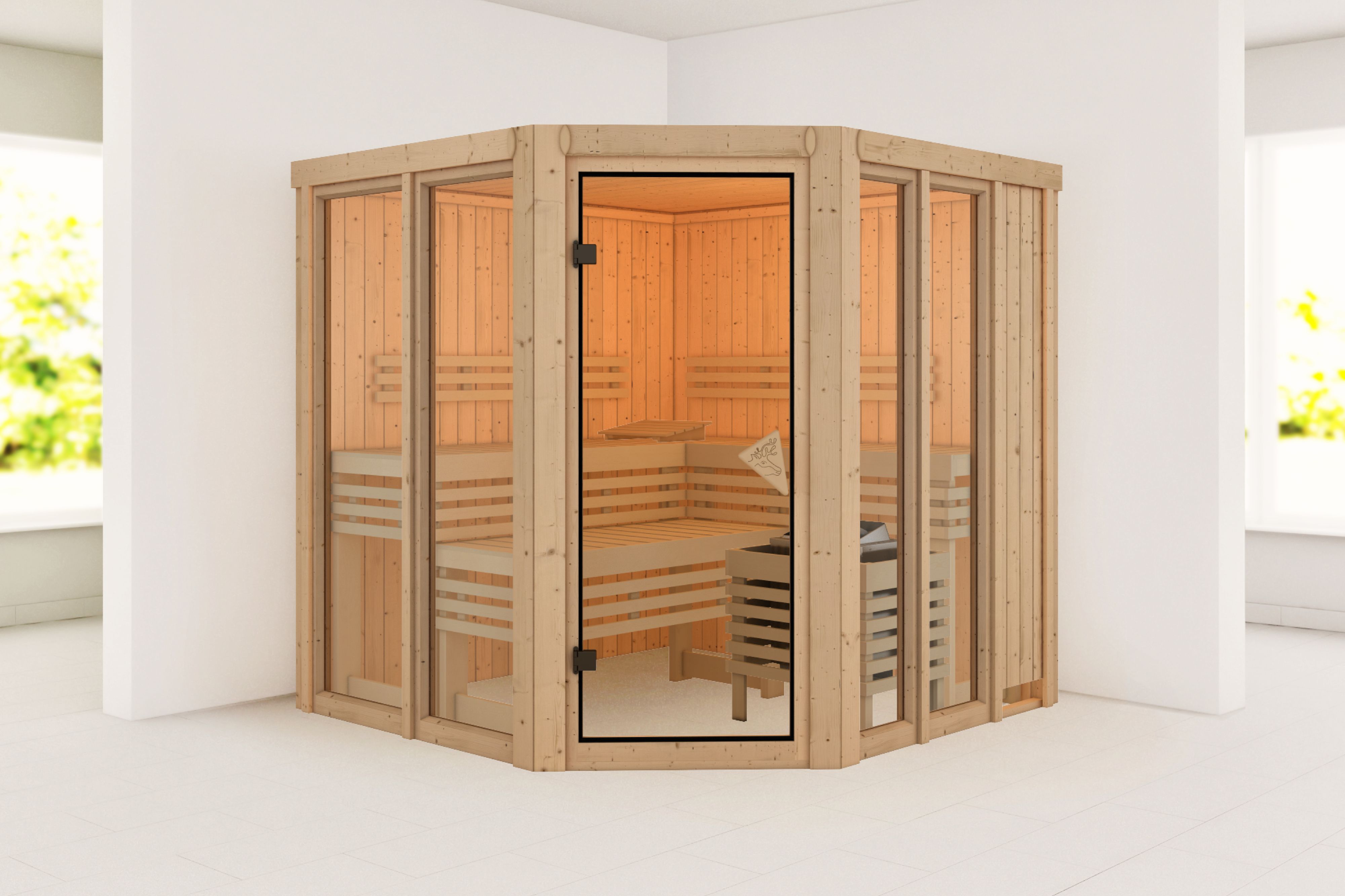 Diese Sauna vereint durchdachte Technik mit klarer Formensprache und schafft einen Ort, an dem sich Wärme, Ruhe und Design auf natürliche Weise verbinden. Mit ihren großzügigen Außenmaßen von 196 x 196 cm bietet sie ausreichend Platz für ausgedehnte Saunagänge – ob alleine, zu zweit oder als entspannter Wochenend-Rückzugsort mit der Familie. Der Eckeinstieg macht die Platzierung besonders flexibel und erlaubt es, die Sauna selbst in verwinkelten Räumen oder in durchdacht geplanten Wellnessbereichen optimal zu integrieren. Dank des spiegelbaren Aufbaus passt sie sich dabei mühelos an Ihre räumlichen Gegebenheiten an. Die 68 mm starke Wandkonstruktion in solider Elementbauweise sorgt für hohe Stabilität und eine lange Lebensdauer. Im Inneren der Wände unterstützt eine Mineralwolldämmung die gleichmäßige Wärmeverteilung und hält die Temperatur effizient auf konstantem Niveau – perfekt für entspannte, tiefe Saunagänge, bei denen man nicht nur körperlich, sondern auch mental abschalten kann. Ob nach einem aktiven Tag, als gesundes Ritual im Winter oder einfach, um sich einen Moment der Ruhe zu gönnen: Diese Sauna schafft dafür die ideale Umgebung. Ein gestalterisches Highlight ist die bronzierte Ganzglastür, die gemeinsam mit zwei seitlich platzierten bronzierten Fensterelementen die Front prägt. Die integrierten Blendapplikationen sorgen dabei für eine sanfte Lichtstreuung und schenken dem Innenraum eine geschützte, fast intime Atmosphäre. Das getönte Glas verleiht der Sauna eine warme, edle Optik und bewahrt zugleich die gewünschte Privatsphäre – ein harmonisches Zusammenspiel aus Transparenz und Geborgenheit. Im Inneren lädt das Interieur mit zwei komfortablen 57 cm tiefen Bänken aus Espe-Holz zum Sitzen, Liegen und Verweilen ein. Die helle, astarme Holzart bleibt auch bei höheren Temperaturen angenehm auf der Haut und sorgt für ein natürliches, beruhigendes Raumgefühl. Eine Kopfstütze aus Espe unterstützt zusätzlich eine entspannte Haltung. Das Ofenschutzgitter aus Fichte fügt sich optisch harmonisch in das Design ein und sorgt für Sicherheit – besonders dann, wenn auch Kinder mit saunieren oder Sie sich frei im Raum bewegen möchten. Wer dem Raum noch mehr Atmosphäre verleihen möchte, kann die Sauna mit einem optional erhältlichen Dachkranz mit integrierten LEDs ausstatten. Das indirekte Licht bringt die natürliche Maserung des Holzes besonders zur Geltung und taucht den Innenraum in eine stimmungsvolle, sanft leuchtende Kulisse – ideal für Abendstunden, an denen Sie die Sauna nicht nur als Wärmequelle, sondern als vollständigen Rückzugsort erleben möchten. Diese Sauna ist kein Standardprodukt, sondern ein Teil Ihrer persönlichen Auszeitkultur. Sie schenkt Ihnen regelmäßig Momente, in denen der Alltag draußen bleibt und der Fokus ganz auf dem Hier und Jetzt liegt – ein Ort zum Atmen, Aufwärmen, Entspannen. Ein Ort für Sie.