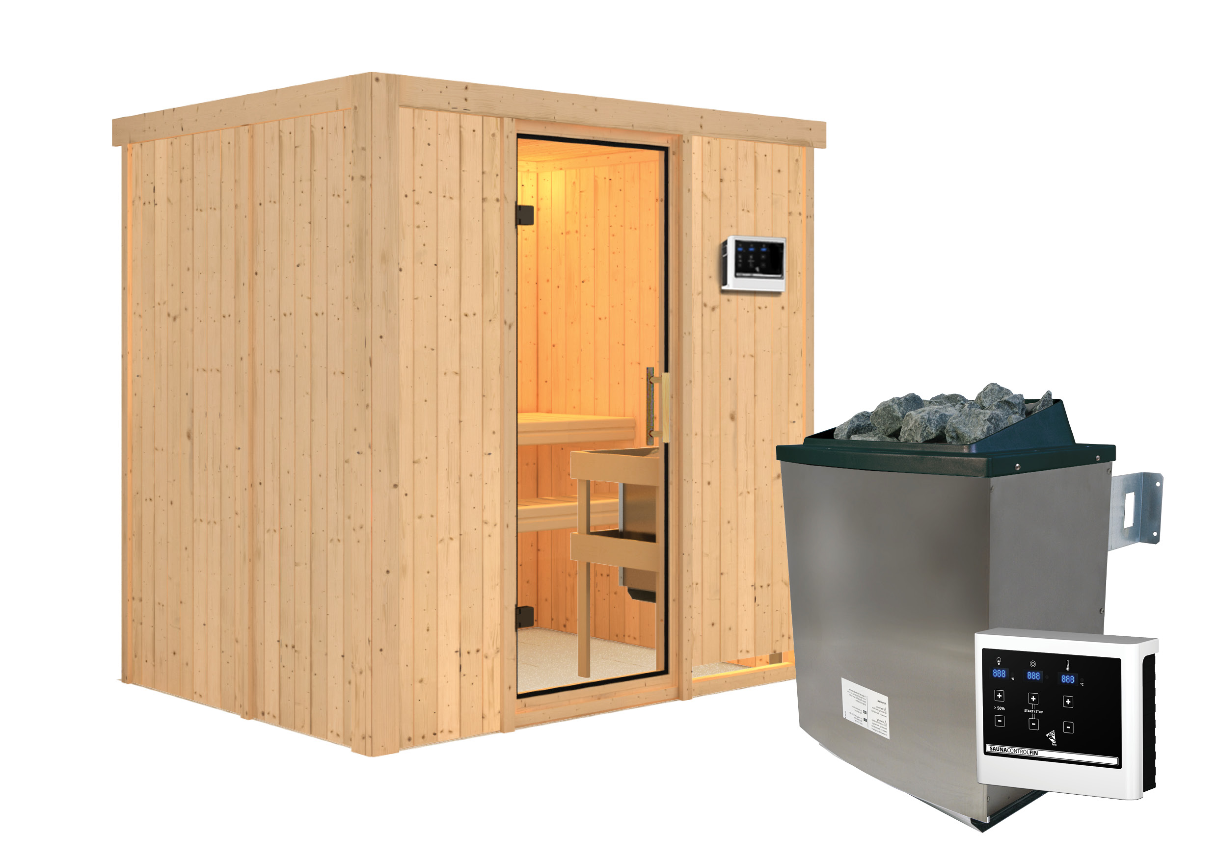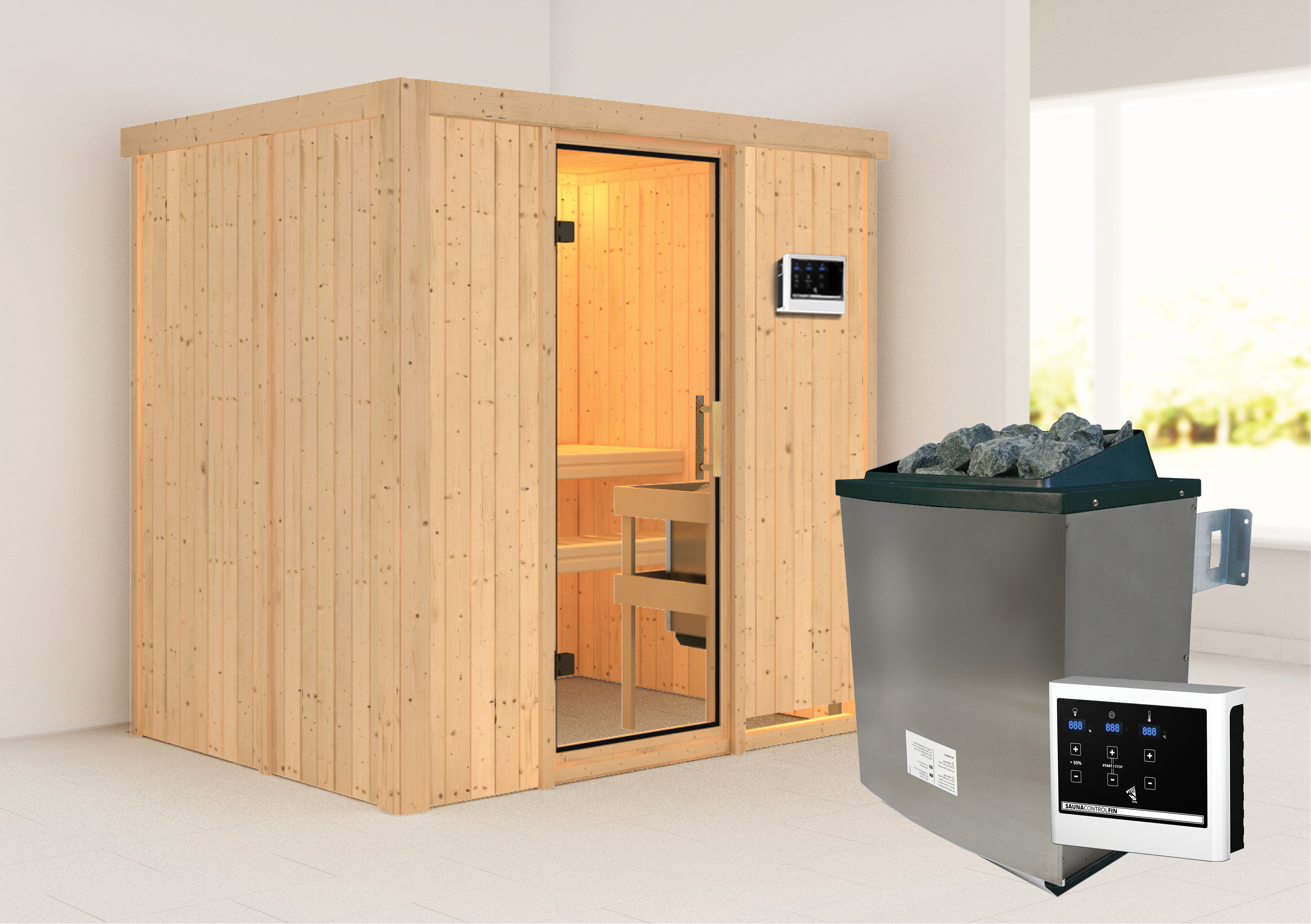 - Set: inkl. 9kW Ofen mit externer Steuerung (finnisch) / 18KG Diabassteine / Kopfstütze classic