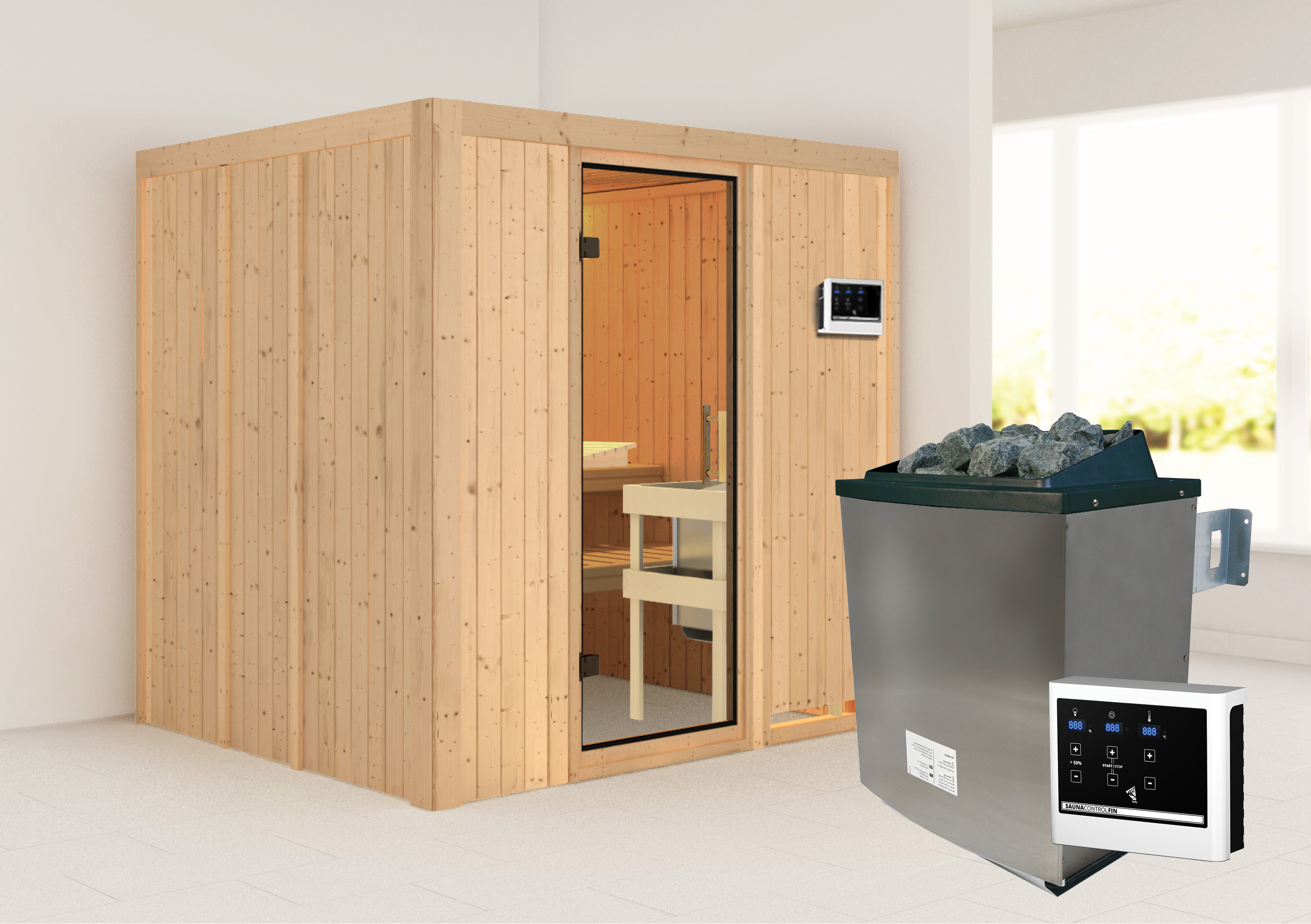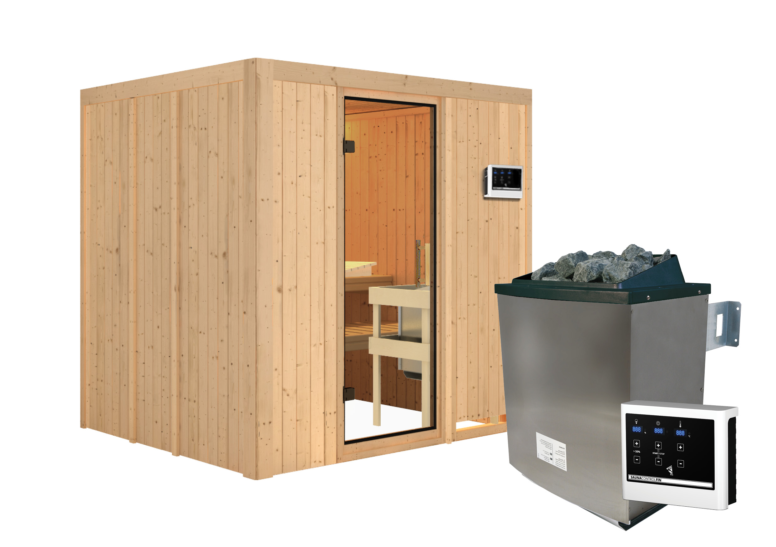 - Set: inkl. 9kW Ofen mit externer Steuerung (finnisch) / 18KG Diabassteine / Kopfstütze classic
