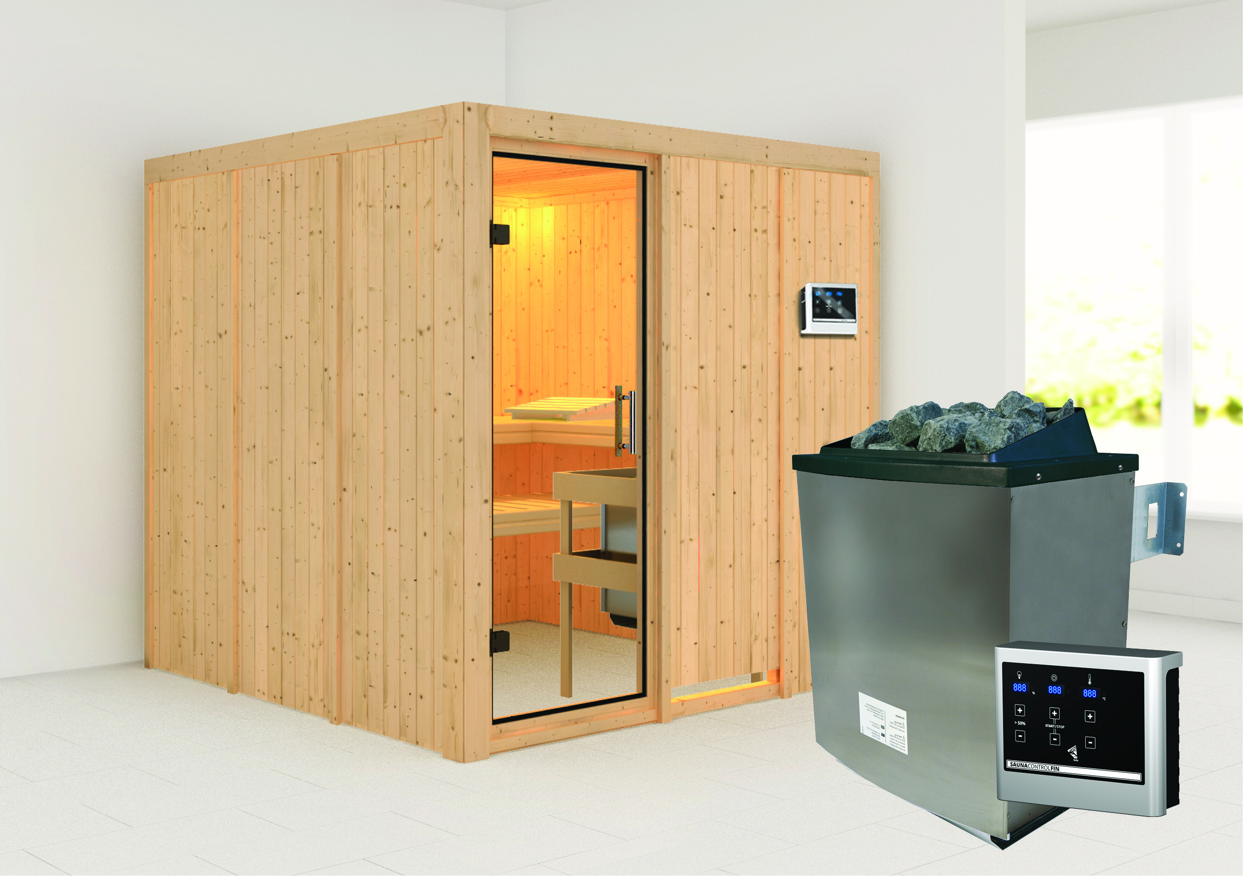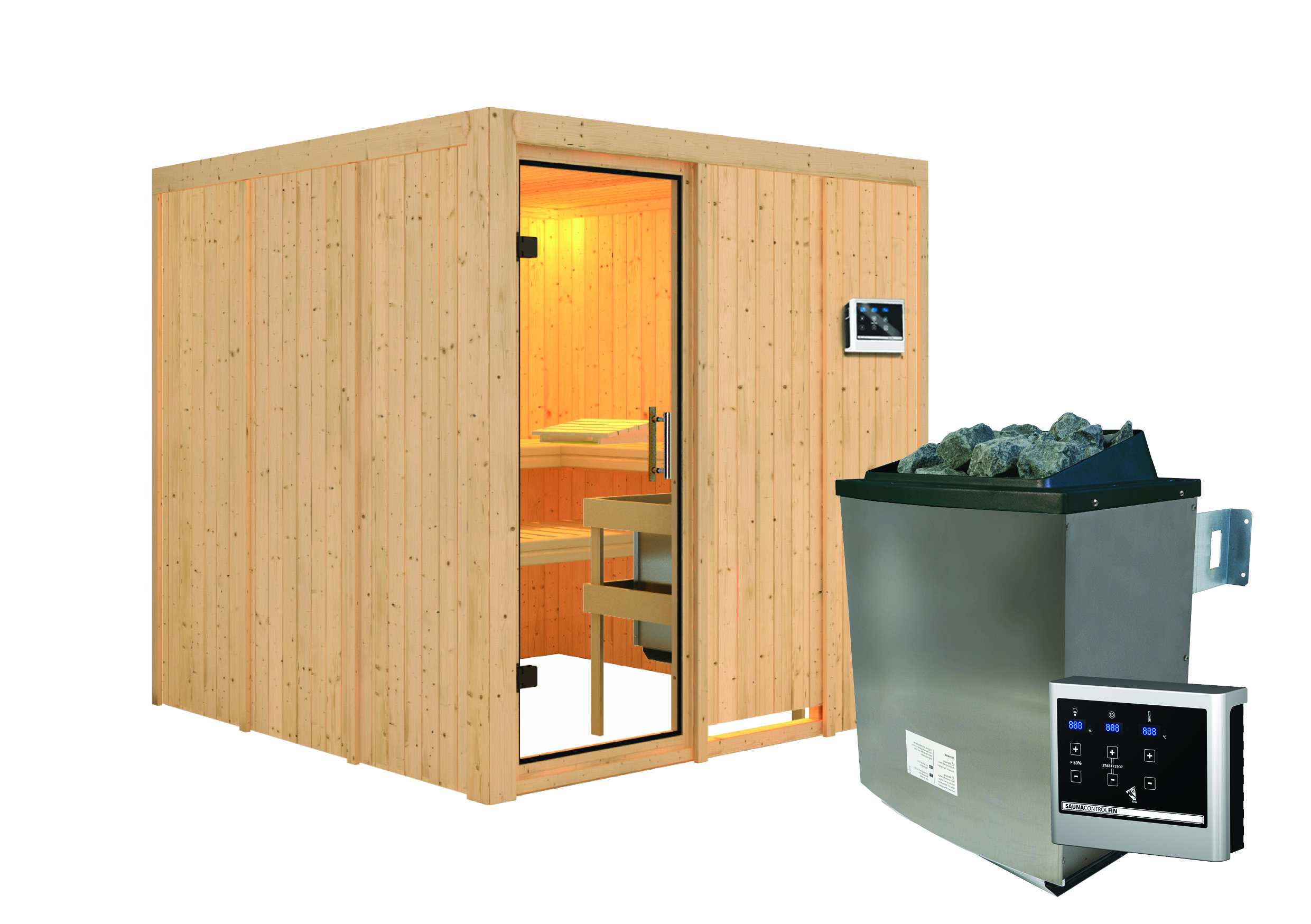 - Set: inkl. 9kW Ofen mit externer Steuerung (finnisch) / 18KG Diabassteine / Kopfstütze classic