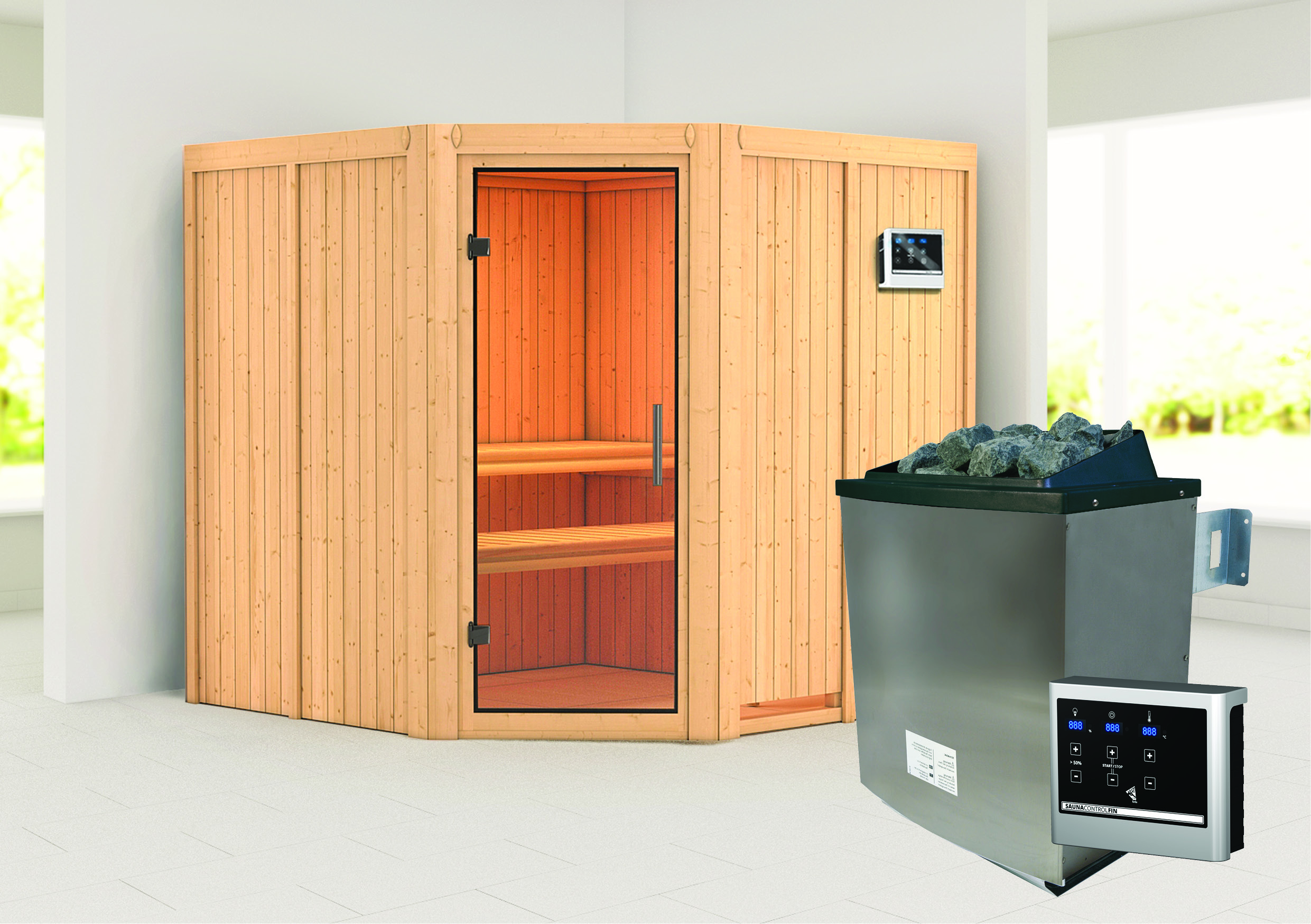 - Set: inkl. 9kW Ofen mit externer Steuerung (finnisch) / 18KG Diabassteine / Kopfstütze classic