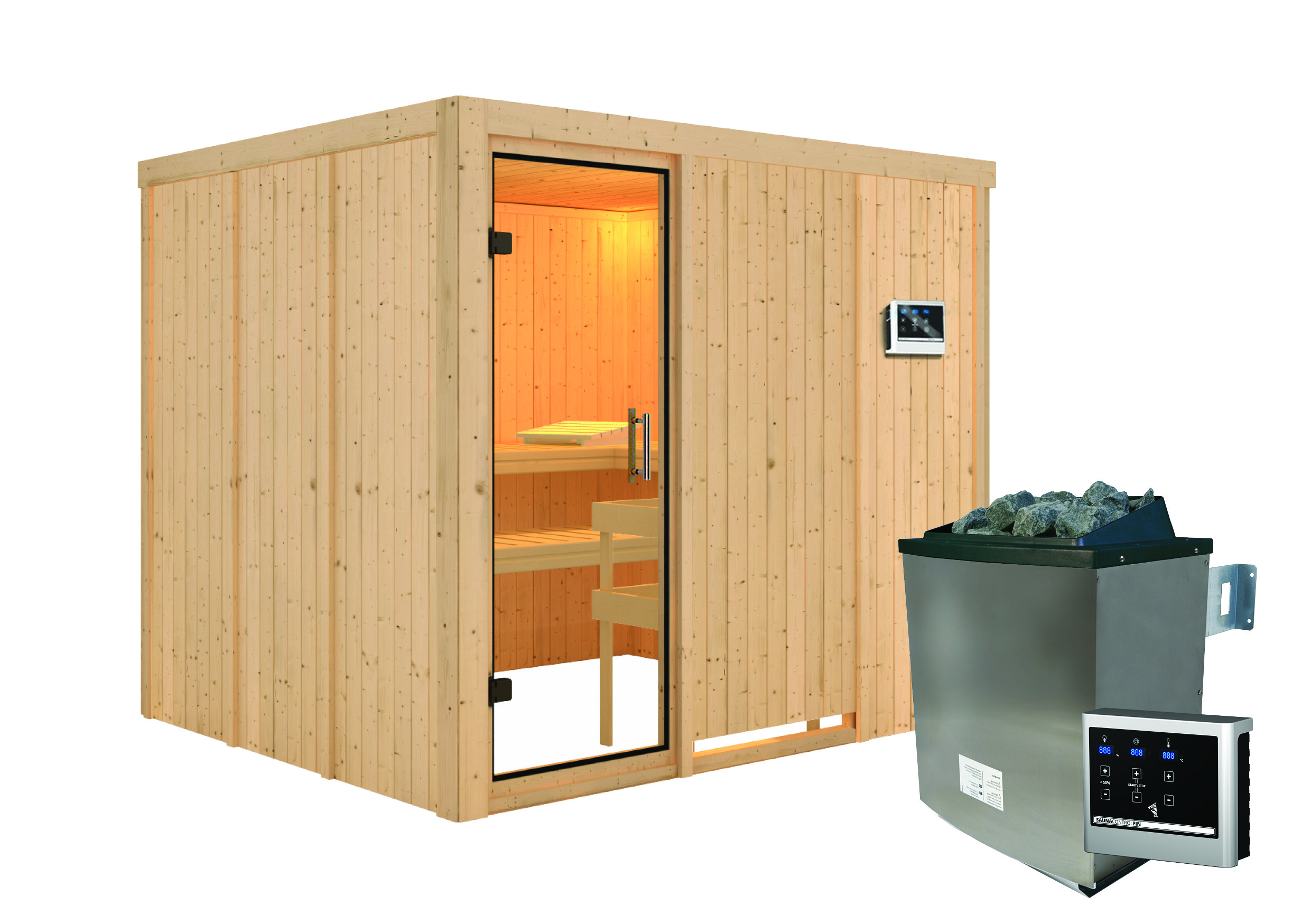 - Set: inkl. 9kW Ofen mit externer Steuerung (finnisch) / 18KG Diabassteine / Kopfstütze classic