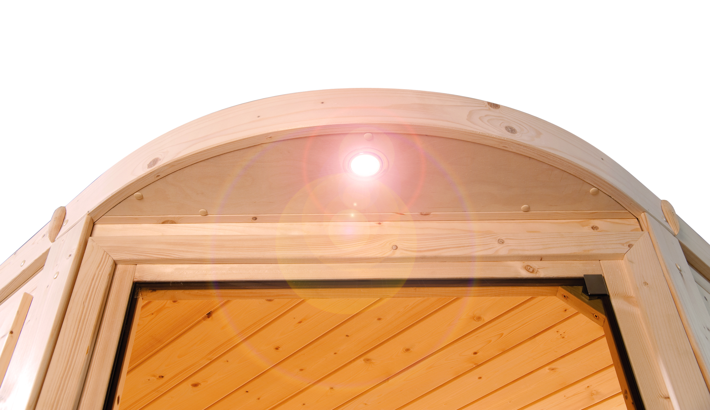 Die Rundbogensauna Kodiak besticht durch einen ansprechenden Eingangsbereich mit Rundbogen und einem 7,5Watt LED-Spot. Eine 68mm starke Konstruktion, bestehend aus einer Rahmenkonstruktion mit 42mm starker Mineraldämmwolle und einer Verkleidung an der SichtseiteOff 12,5mm Spezial-Softline-Profilholz, hält die Wärme optimal im Saunainneren. Die Decke besteht aus einer 57mm starken Spezialplatte mit Mineraldämmwolle. Die Außenmaße betragen 245 x 210 x 202cm (B/T/H).Der Innenraum lädt durch 3 Saunabänke aus Espenholz zum Entspannen und Wohlfühlen ein. Mit einem optional erhältlichen 9kW-Saunaofen bringen Sie das Innere schnell auf Temperatur. Der Rundbogen mit LED-Spot sorgt nicht nur für einen echten Hingucker, sondern setzt Ihre Sauna gekonnt in Szene. In den Innenraum gelangen Sie durch einebrazed all-glass door aus Einscheibensicherheitsglas mit Karibu-Türgriff. Ein bronziertes Saunafenster rundet das Gesamtbild Ihrer Wellness-Oase ab. Durch die vorgefertigten Wand - und Deckenelemente wird Ihnen ein einfacher Aufbau ermöglicht. Passen Sie die Sauna auf Ihre Bedürfnisse an mit unserem optional erhältlichen Zubehör. Eine ergonomische Kopfstütze für den optimalen Liegekomfort, eine ergonomische Rückenlehne zur perfekten Entspannung oder eine Saunaleuchte modern für das richtige Ambiente. Genießen Sie die Ruhe nach einem anstrengenden Arbeitstag bei einem ausgiebigen Saunagang und erholen Sie sich vom Alltag. Gestalten Sie sich Ihre eigene kleine Wellness-Oase in Ihren vier Wänden mit der ansprechenden Kodiak.