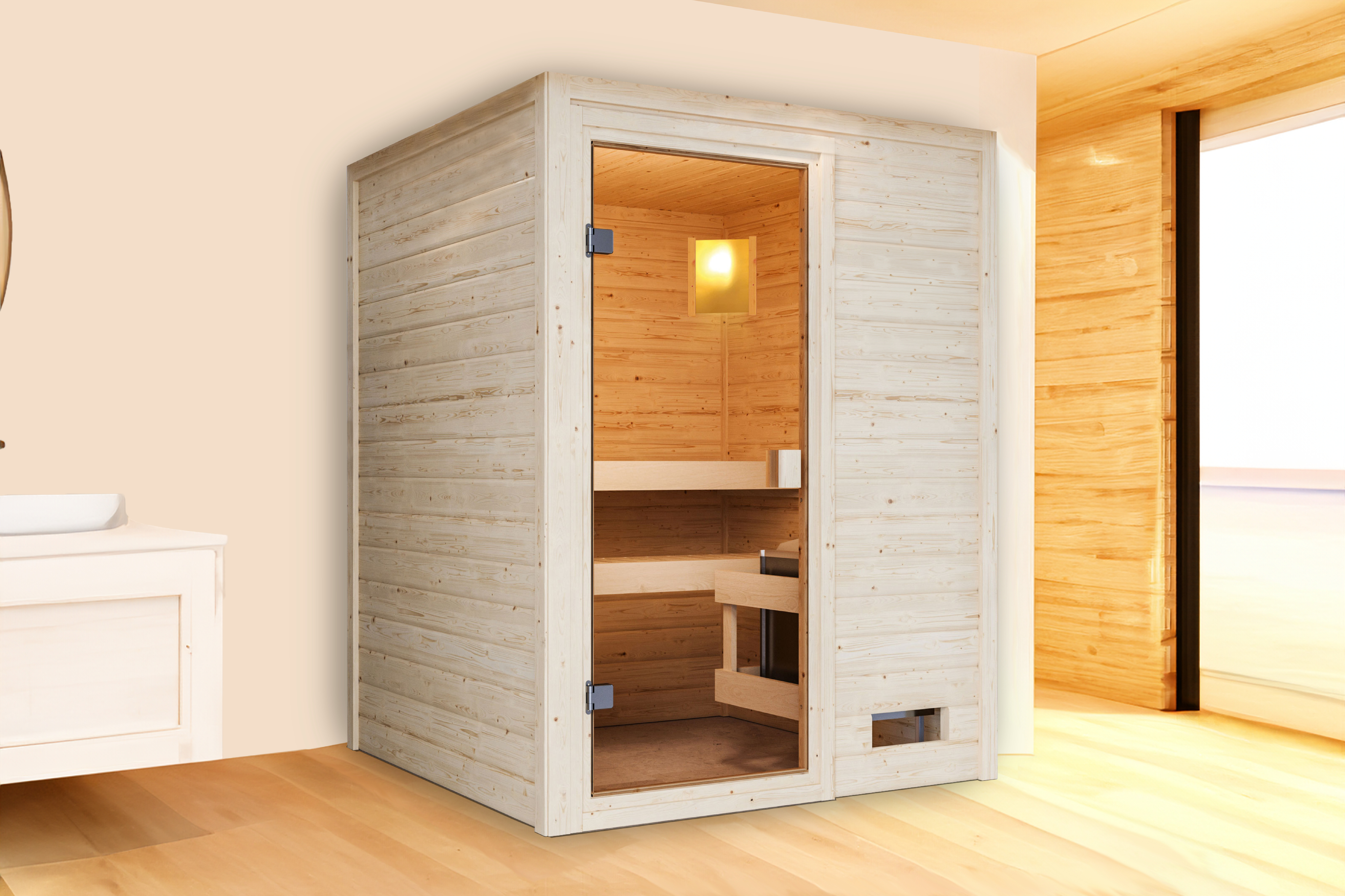 Karibu Massivholzsauna "Sauna Mila 1" 2 Personen 9 kW Bio-Kombi Ofen + Steuergerät HUUM WIFI