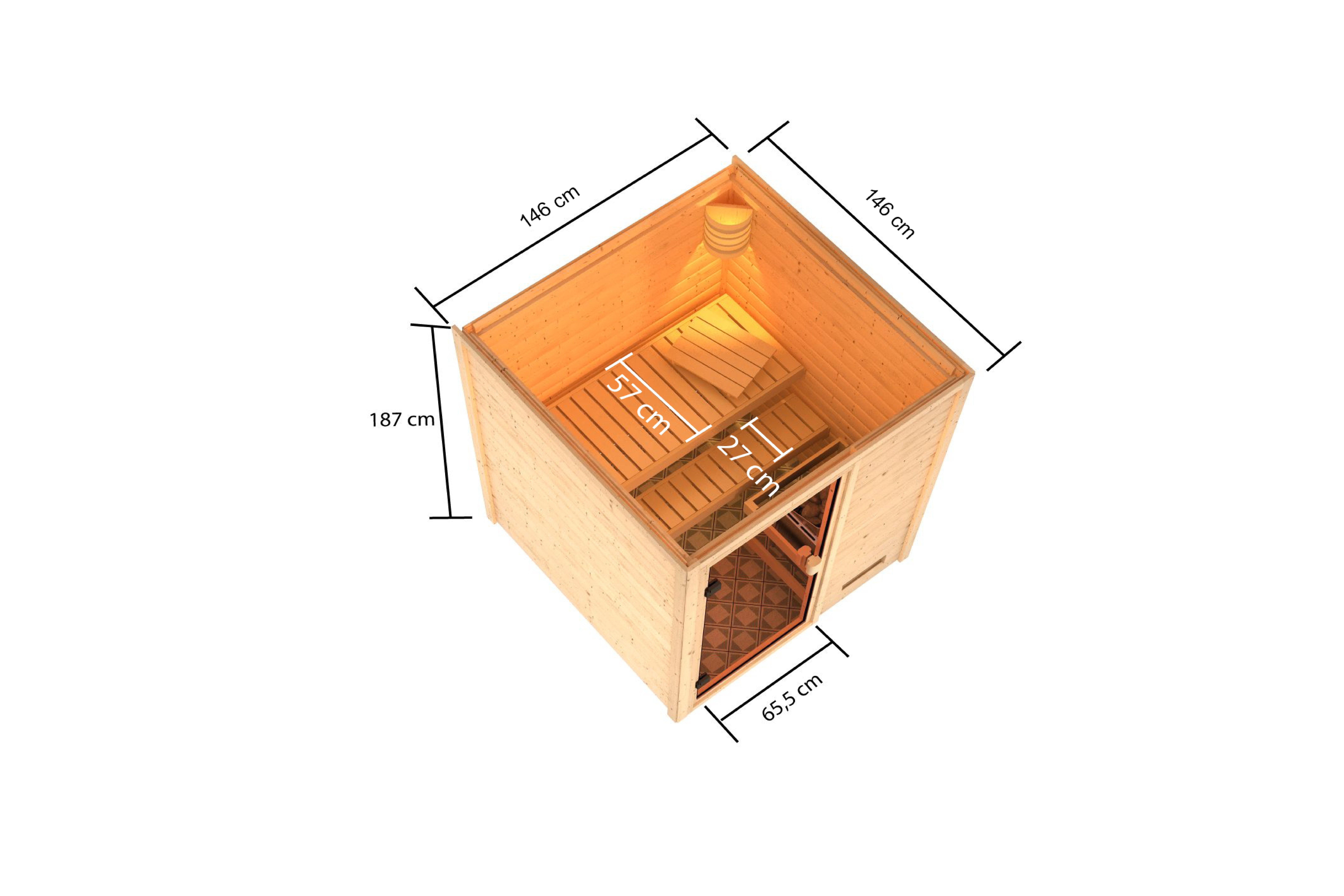 Was eignet sich für einen bislang ungenutzten Kellerraum besser, als eine eigene Sauna zum Entspannen und Wohlfühlen? Die Sauna Mila 1 hat ein Außenmaß von 146 x 146 cm und ist, aufgrund seiner geringen Höhe von 187 cm, ideal auch für Räume mit einer niedrigen Deckenhöhe geeignet. Die Massivholzsauna besteht aus 38mm starken Wandbohlen aus nordischer Fichte, welche im einfachen Steck- und Schraubsystem montiert werden. Durch den Fronteinstieg und die schlichte, rechteckige Form passt sie sich jeder Umgebung mühelos an. In den Innenraum gelangen Sie durch eine bronzierte Ganzglastür aus Einscheibensicherheitsglas. Damit beim Saunieren keine Wärme entweichen kann, wird die Tür durch eine Magnetverschlusstechnik geschlossen gehalten. Auf denen, im Lieferumfang enthaltenen, Liegen können Sie den Saunagang so richtig genießen. Entspannen Sie nach einem stressigen Arbeitstag und schöpfen Sie neue Kraft aus der angenehmen Wärme auf Ihrer Haut. Heizen Sie den Innenraum mit 9kW Bio-Ofen auf. Nutzen Sie Ihren Kellerraum zur Entspannung und verwandeln Sie ihn in eine Wellness-Oase mit der Massivholzsauna Sauna Mila 1.