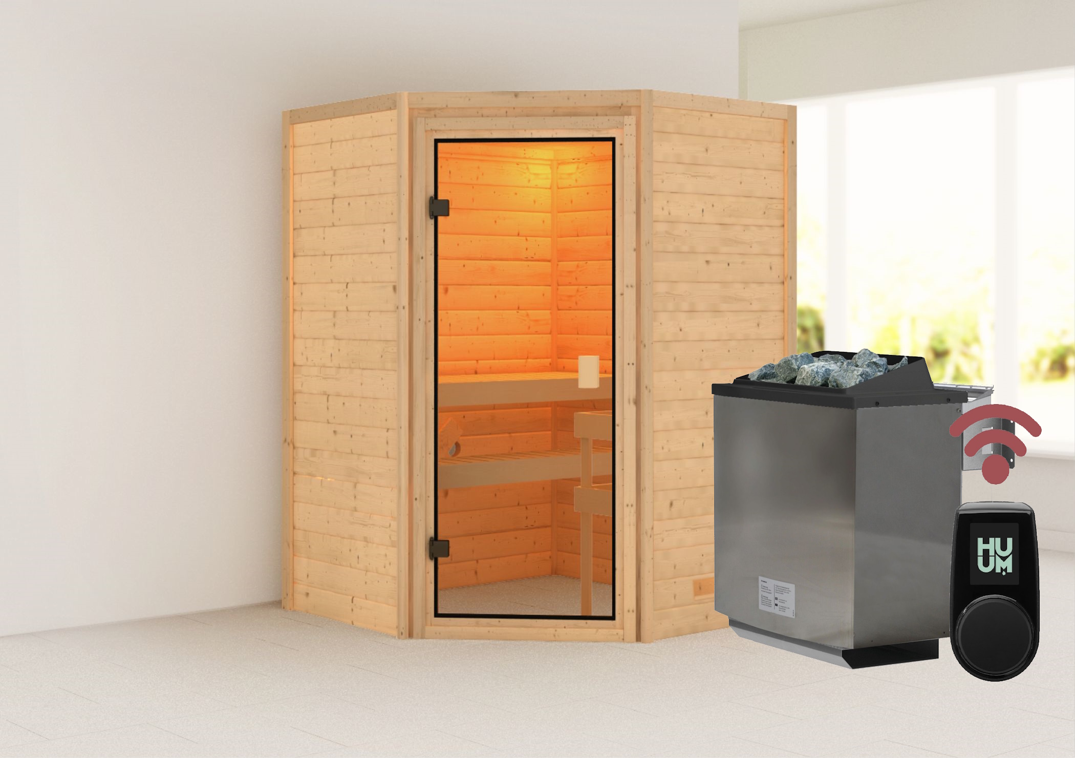 - Sparset: inkl. 9kW BIO-Ofen / HUUM WiFi Steuergerät (App Steuerung möglich) / Saunasteine / Silikonkabel / Saunazubehörset Premium 5 Teilig