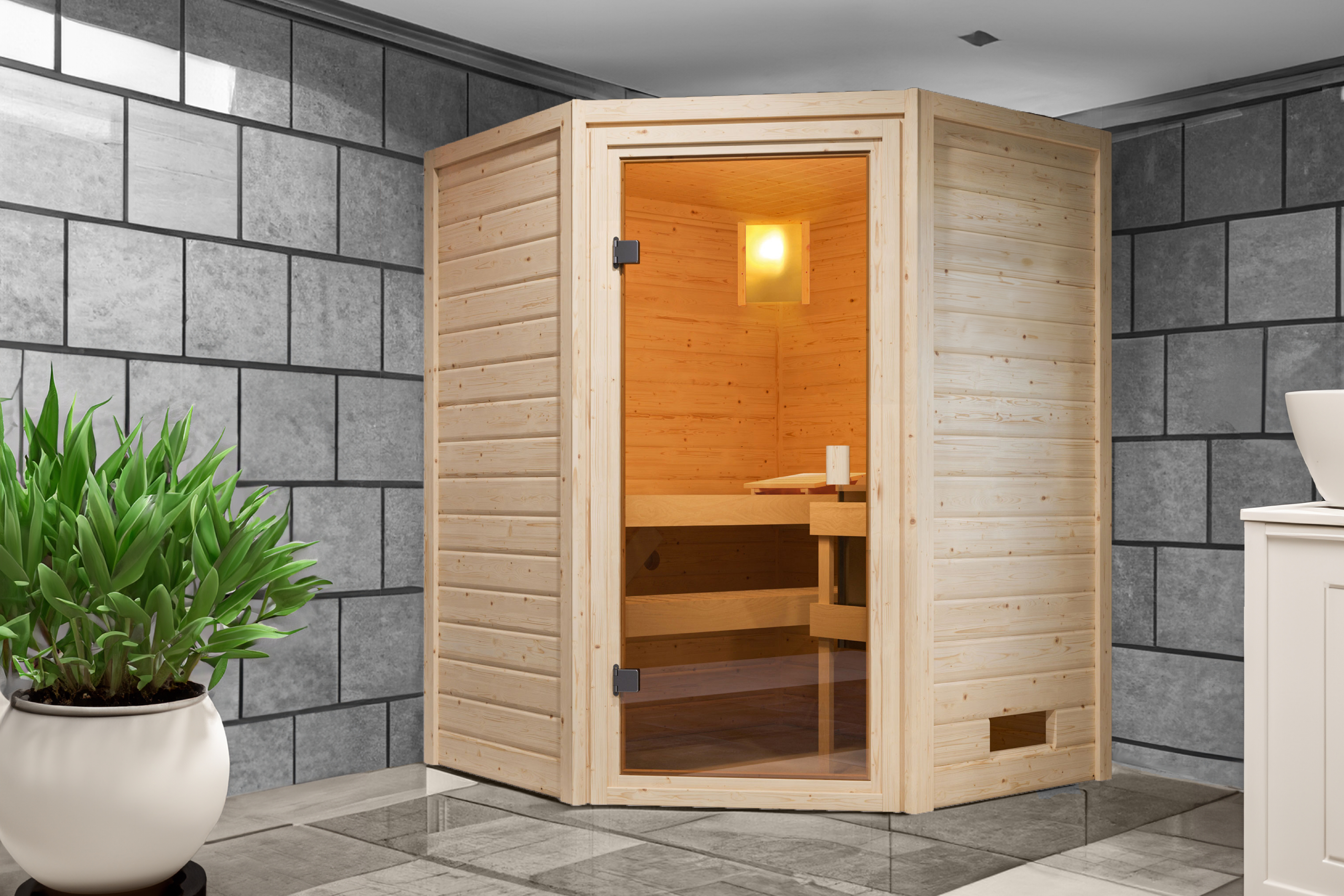 Was eignet sich für einen bislang ungenutzten Kellerraum besser, als eine eigene Sauna zum Entspannen und Wohlfühlen? Die Sauna Mila 2 hat ein Außenmaß von 146 x 146 cm und ist, aufgrund seiner geringen Höhe von 187 cm, ideal auch für Räume mit einer niedrigen Deckenhöhe geeignet. Die Massivholzsauna besteht aus 38mm starken Wandbohlen aus nordischer Fichte, welche im einfachen Steck- und Schraubsystem montiert werden. Durch den Eckeinstieg und die besondere, fünfeckige Form, sorgt die Sauna für ein Highlight in Ihrer Wellness-Oase. In den Innenraum gelangen Sie durch eine bronzierte Ganzglastür aus Einscheibensicherheitsglas. Damit beim Saunieren keine Wärme entweichen kann, wird die Tür durch eine Magnetverschlusstechnik geschlossen gehalten. Auf den, im Lieferumfang enthaltenen, Saunaliegen können Sie den Saunagang so richtig genießen. Entspannen Sie nach einem stressigen Arbeitstag und schöpfen Sie neue Kraft aus der angenehmen Wärme auf Ihrer Haut. Heizen Sie den Innenraum mit 9kW Bio-Ofen auf. Nutzen Sie Ihren Kellerraum zur Entspannung und verwandeln Sie ihn in eine Wellness-Oase mit der Massivholzsauna Sauna Mila 2.