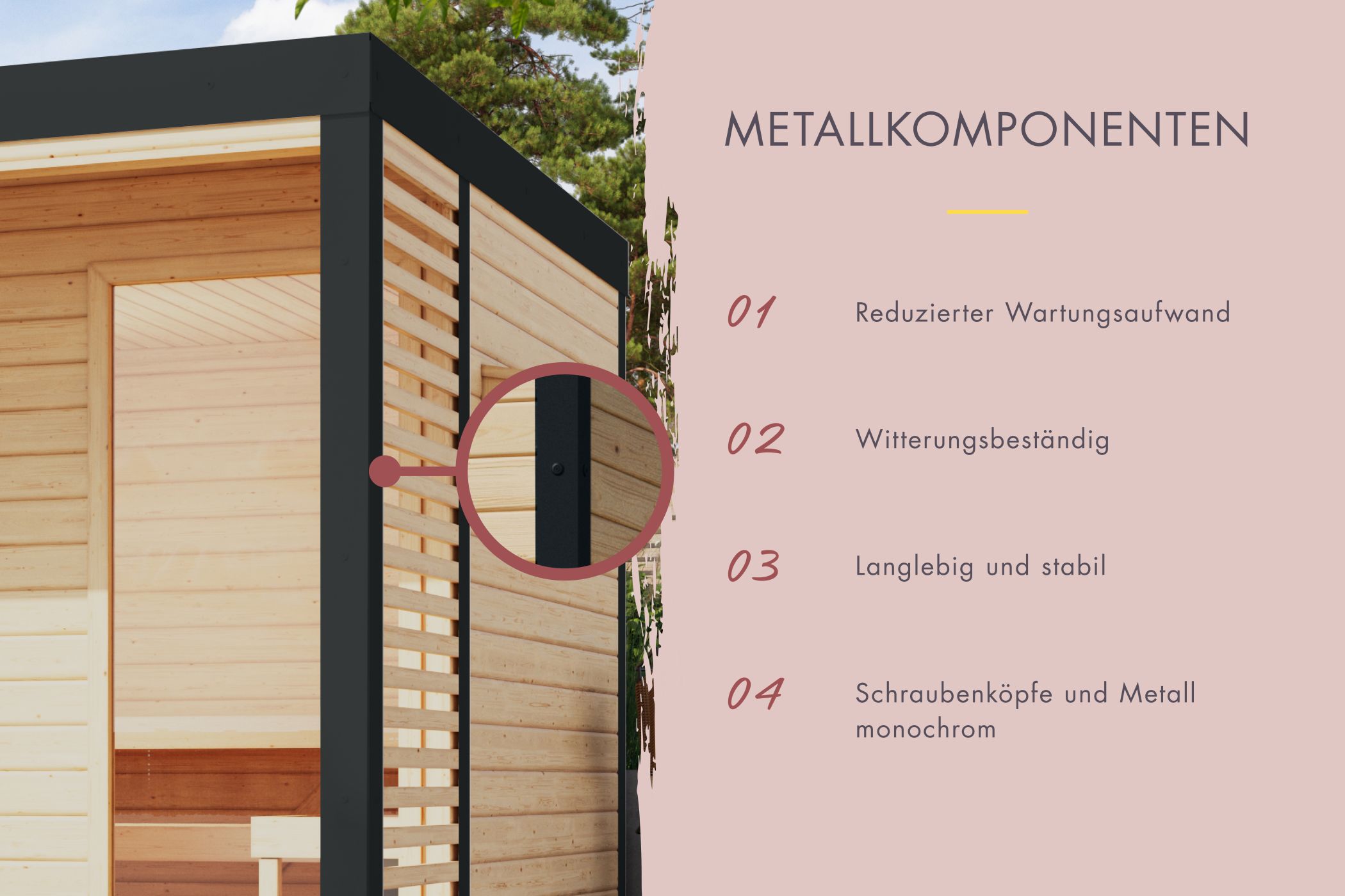 The walls are made of Nordic spruce , known for its natural beauty and robustness. Steel corners verleihen dem Design einen modernen Touch. Ein großer Vorteil ist die geringe Wartung, dank der Stahlelemente im Vergleich zu reinen Holzgartenhäusern. So haben Sie mehr Zeit zum Saunieren statt zur Instandhaltung. Das Gartenhaus ist individualisierbar und in verschiedenen Farben erhältlich, die frei kombiniert werden können. Gestalten Sie es nach Ihrem persönlichen Geschmack und lassen Sie Ihren Garten erstrahlen.