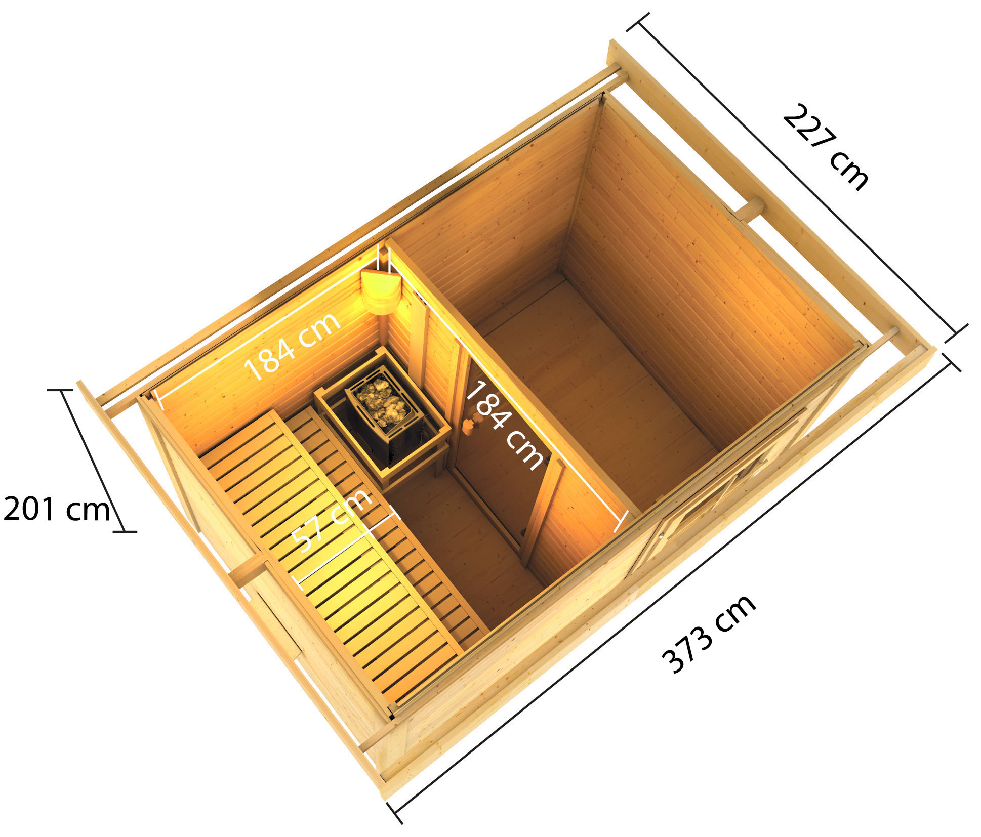 Sie möchten sich vor dem Saunieren in Ruhe in einem angrenzenden Raum entkleiden, sich nach dem Saunagang auf einem gemütlichen Stuhl entspannen oder zum Lagern der benötigten Accessoires nutzen? Diese und viele Vorteile bietet Ihnen die Outdoor sauna Joost 1with Anteroom . Mit einem Gesamtaußenmaß von337 x 196 x 239 cm (B/H/T) schafft das Haus die nötige Fläche für eine Saunakabine zum Entspannen und einem praktischen Anteroom .