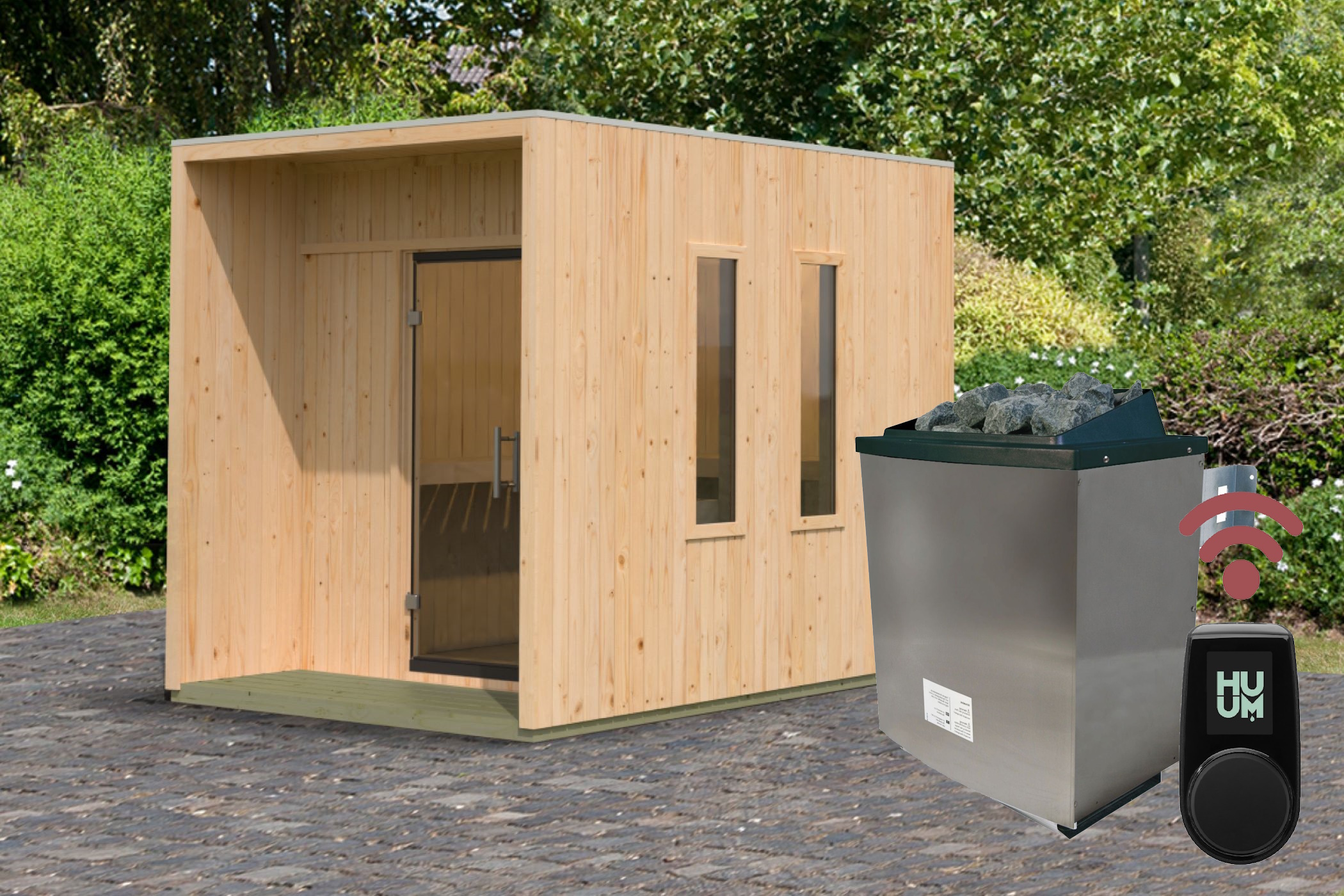 - In the set incl. heater (of your choice)/ HUUM WiFi control unit (app control possible) and sauna stones