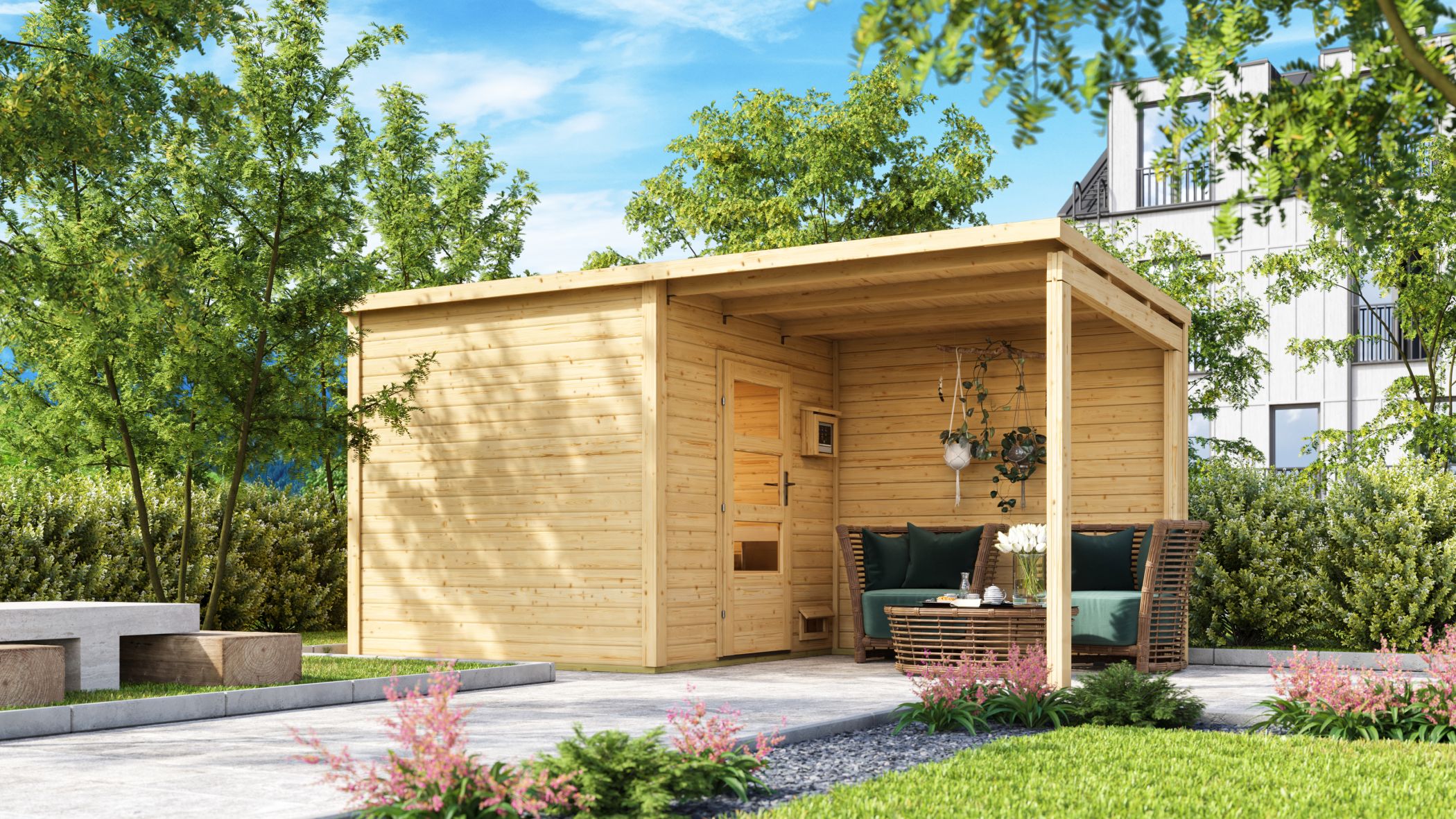 Das Anbaudach mit Rückwand bietet Wind- und Sichtschutz für den Bereich vor Ihrer Sauna. Ein bequemer Liegestuhl für die Entspannung nach dem Saunieren ist hier kaum wegzudenken.
