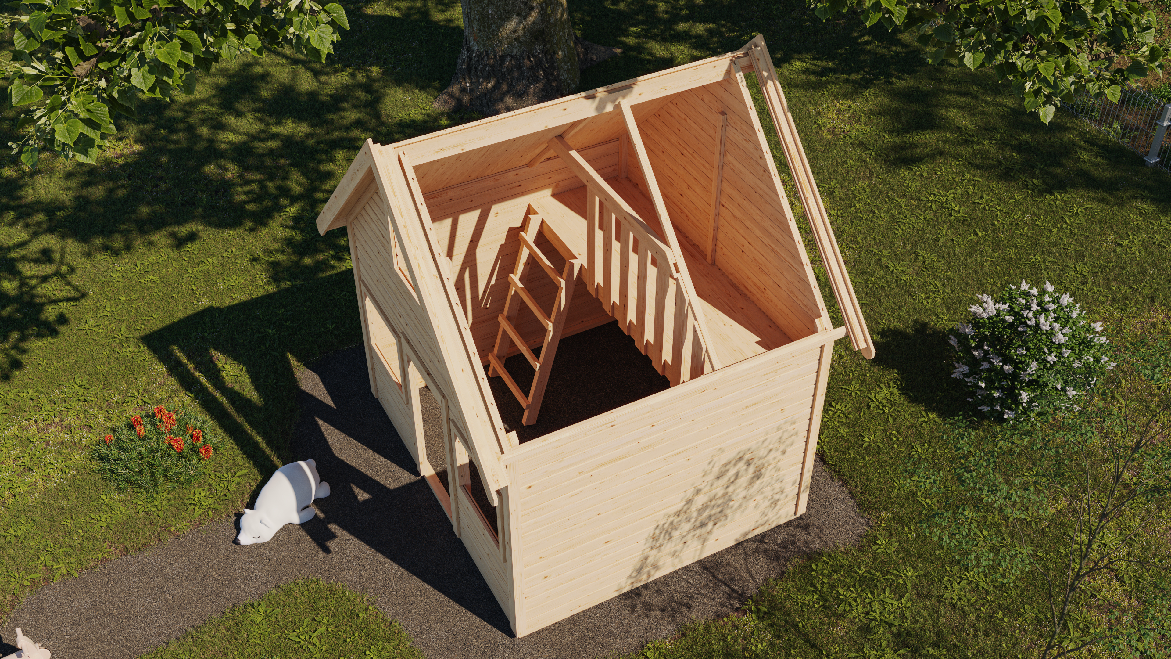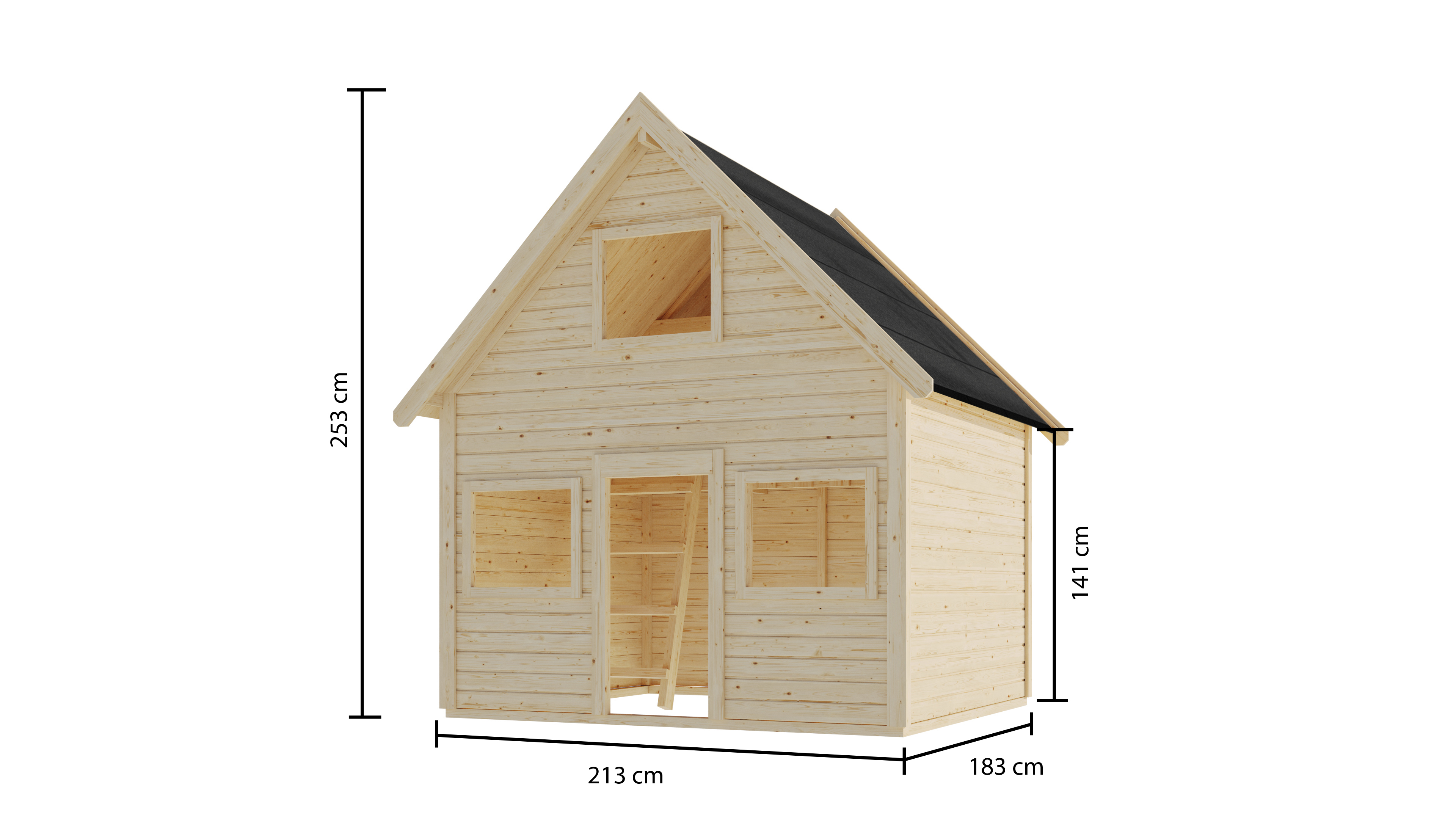 Unser qualitativ hochwertiges Spielhaus hat eine Wandstärke von 19 mm und wird auf die inklusiven KDI- (kesseldruckimprägnierten) Unterleger aufgebaut. Nordische Fichte, kommend aus dem hohen Norden Europas, ist der Rohstoff aus dem wir unser Spielhaus herstellen. Das formschöne und praktische Satteldach aus Holzplatten sorgt bei jedem Wetter für den Schutz, den Ihre Kinder brauchen. Die Seitenwand ist 141 cm hoch, bis zur Spitze des Daches gemessen sind es 253 cm. Den Zutritt verschaffen sich Ihre kleinen Großen über den Türausschnitt mit einem Maß von 47,5 cm x 97,5 cm. Die Besonderheit unseres Spielhauses Kalle besteht in der zusätzlichen Ebene, welche es Ihren Kindern ermöglicht, auf 2 Etagen zu spielen.