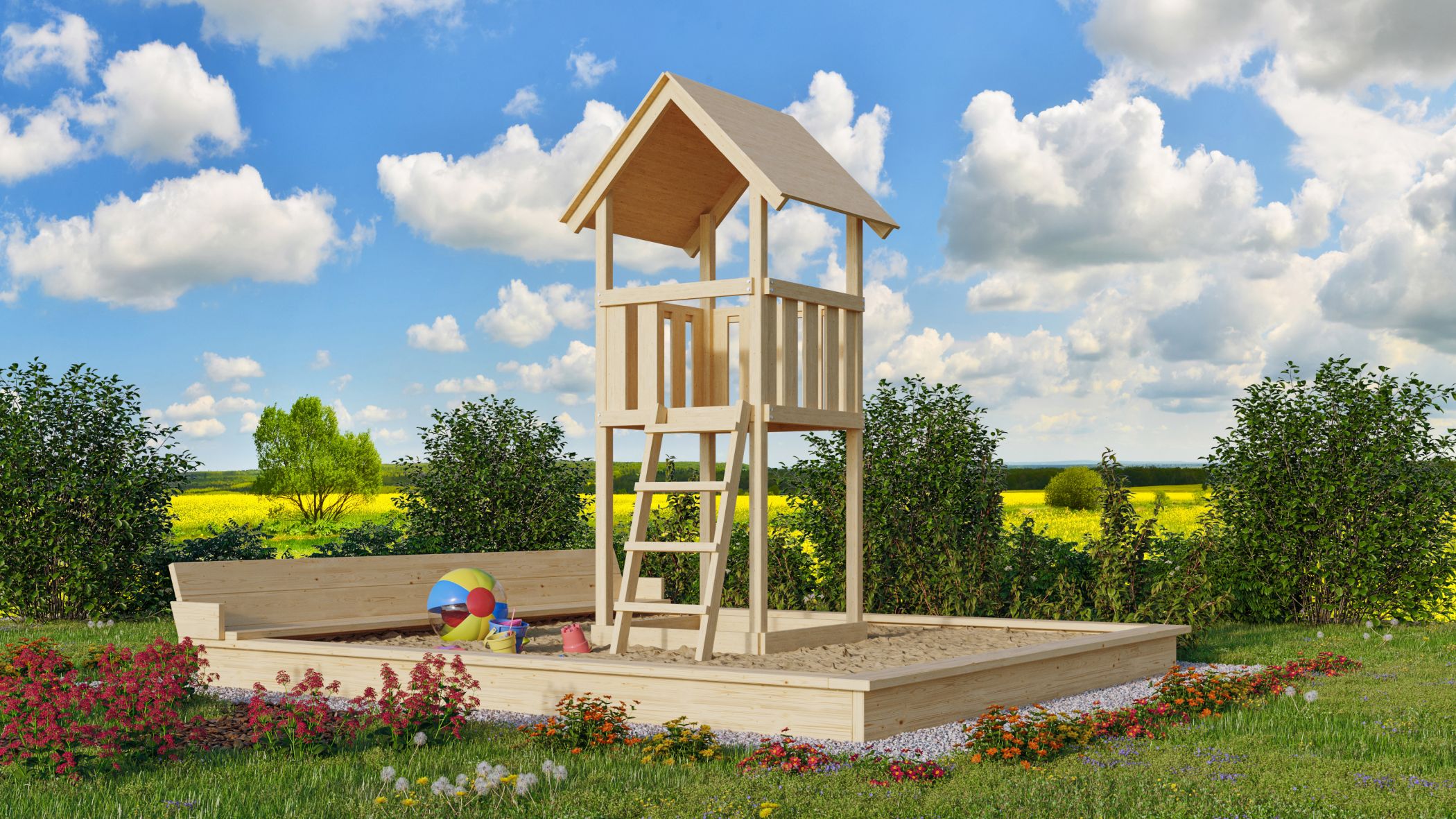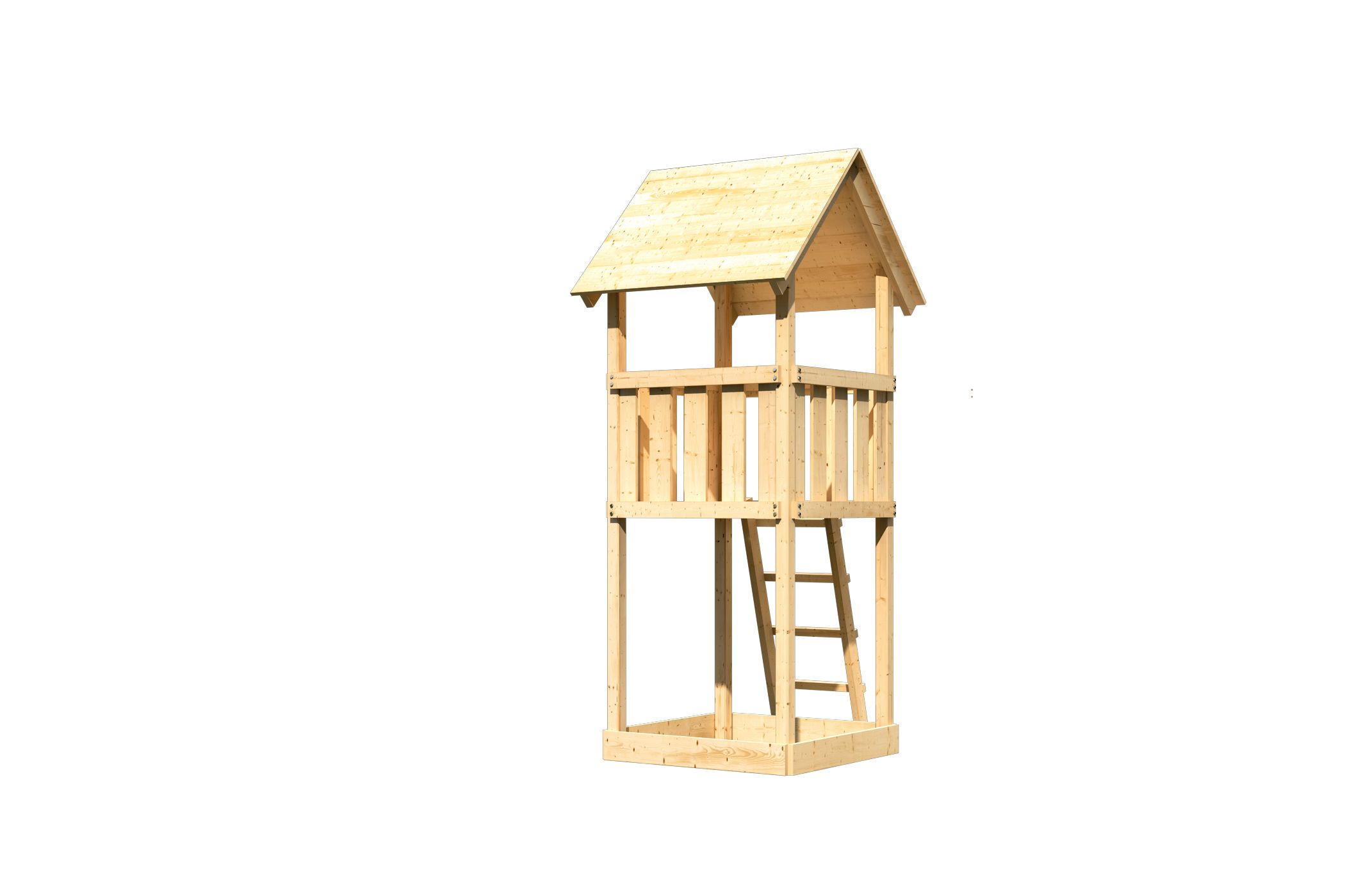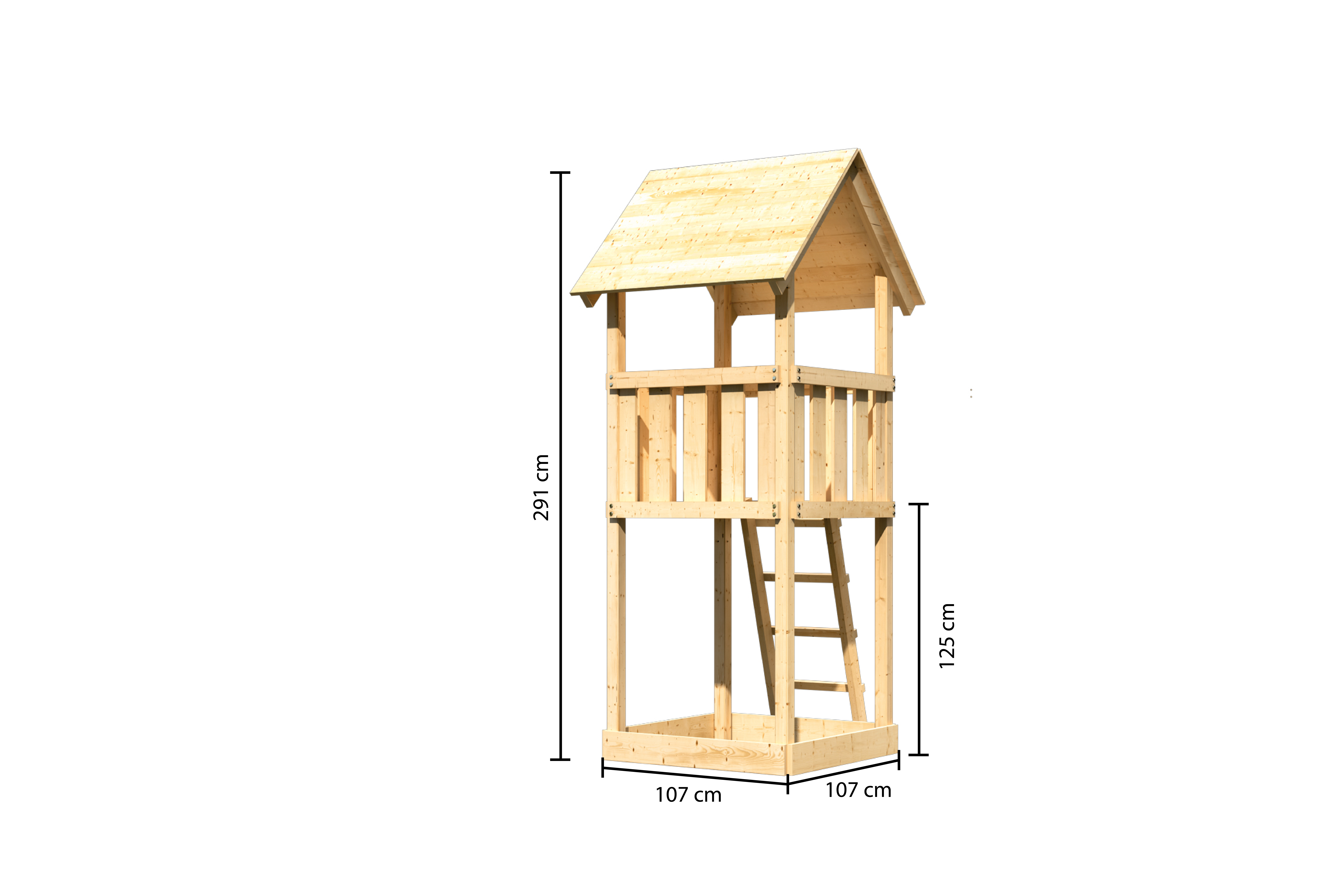 Best natural Nordic spruce wood with a basic construction of 68 x 68 mm thick posts. Our wood comes from the far north of Europe and is absolutely untreated. This makes it free of all known problematic substances that could penetrate the wood during boiler pressure impregnation. The platform height of 125 cm offers the best views and makes your child's imagination bloom. The gable roof and the parapet boards are made of 18 mm thick boards and offer high stability and thus long-lasting safety.