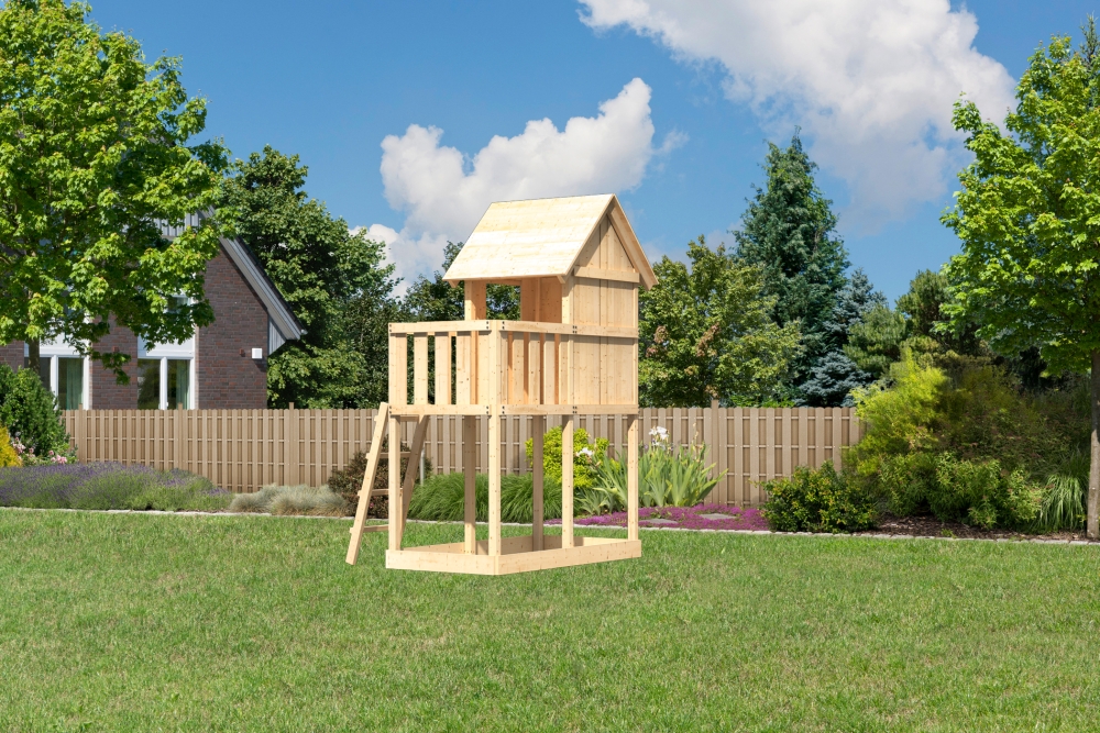 Our beautiful stilt house Frieda offers the best combination of the two article groups stilt house and play tower. Due to the tightly closed platform on three sides with window cut-outs, the play tower looks like a stilt house at first glance, but has the basic construction of a play tower.