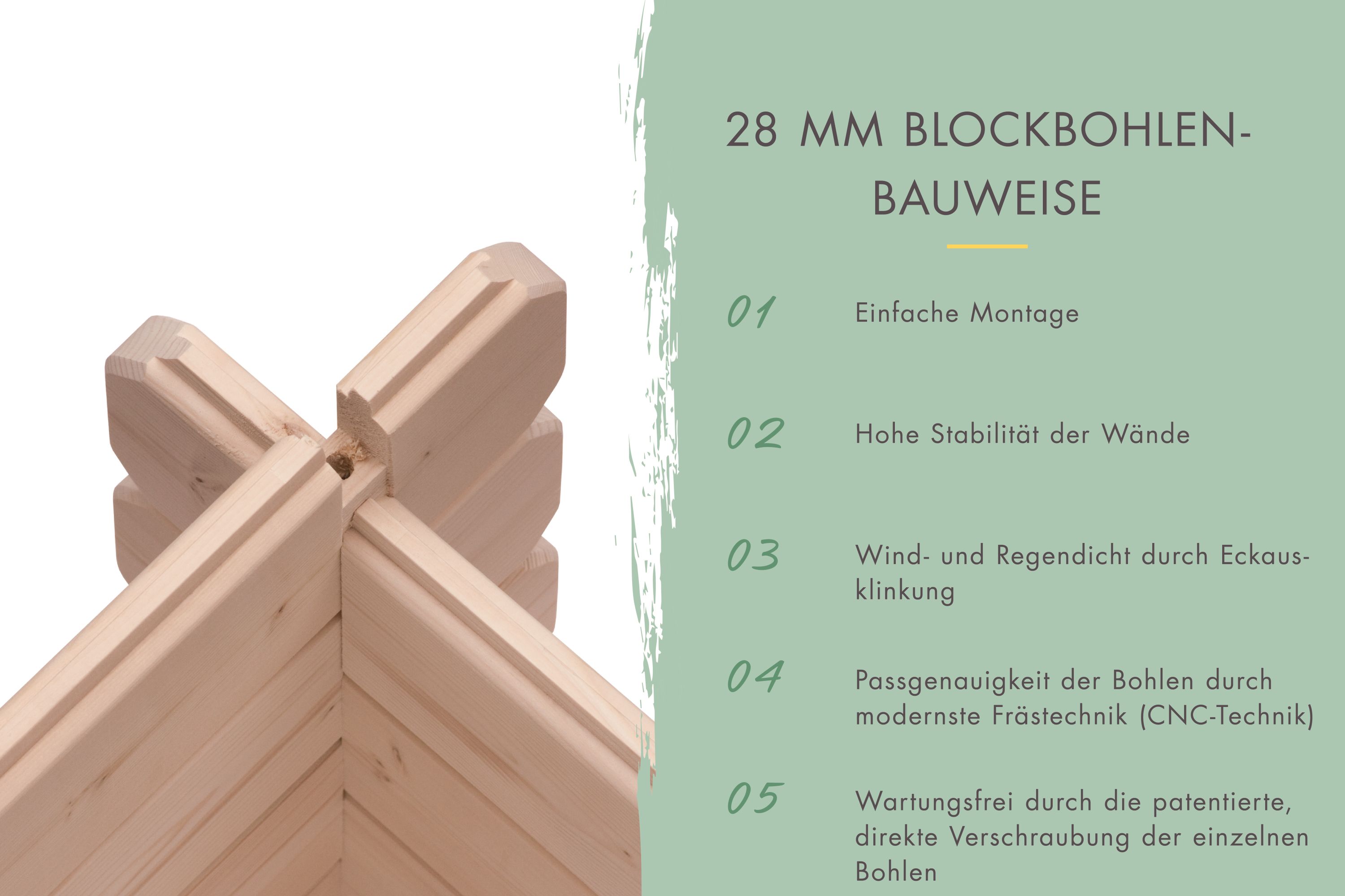 Das Blockbohlenhaus aus nordischer Fichte wird aus 28 mm Wandbohlen in klassischer Blockbohlenbauweise gefertigt und kann somit rasch und einfach aufgebaut werden. Bei der Blockbohlenbauweise werden die Wandbohlen reihum montiert. Begonnen wird mit einer halben, also unten glatten Bohle. Die patentierte 6-Plus-Eckverbindung sorgt dabei für höchste Wind- und Regendichte. Die Schraublöcher in den Blockbohlen sind werkseitig vorgefertigt und vereinfachen den Aufbau enorm. Das praktische Pultdach besteht aus Masssivholzdach. Der vordere Dachüberstand ist mit 200 mm ausreichend groß dimensioniert, um den Eingangsbereich wirkungsvoll zu schützen. Dank der Seitenhöhe von 189,5 cm und einer Firsthöhe von 205 cm sorgt das Gerätehaus innen viel Platz. Kesseldruckimprägnierte Bodenbalken sorgen für optimalen Schutz gegen aufsteigende Feuchtigkeit. Durch die Positionierung unter dem Gartenhaus schützen die Bodenbalken effektiv vor Staunässe und Spritzwasser. Das Gartenhaus wird mit der praktischerweise vormontierten Tür im stabilen Massivholzrahmen ausgeliefert und bietet dank der großen Öffnung bequemen Zutritt in das Haus. Nebenbei bietet sie effektiven Schutz vor Diebstahl von den Gegenständen die sich im Haus befinden. Gleichzeitig lassen die 3 großzügigen Lichtausschnitte im jeweiligen Türflügel viel und reichlich Tageslicht in das Gartenhaus einströmen.