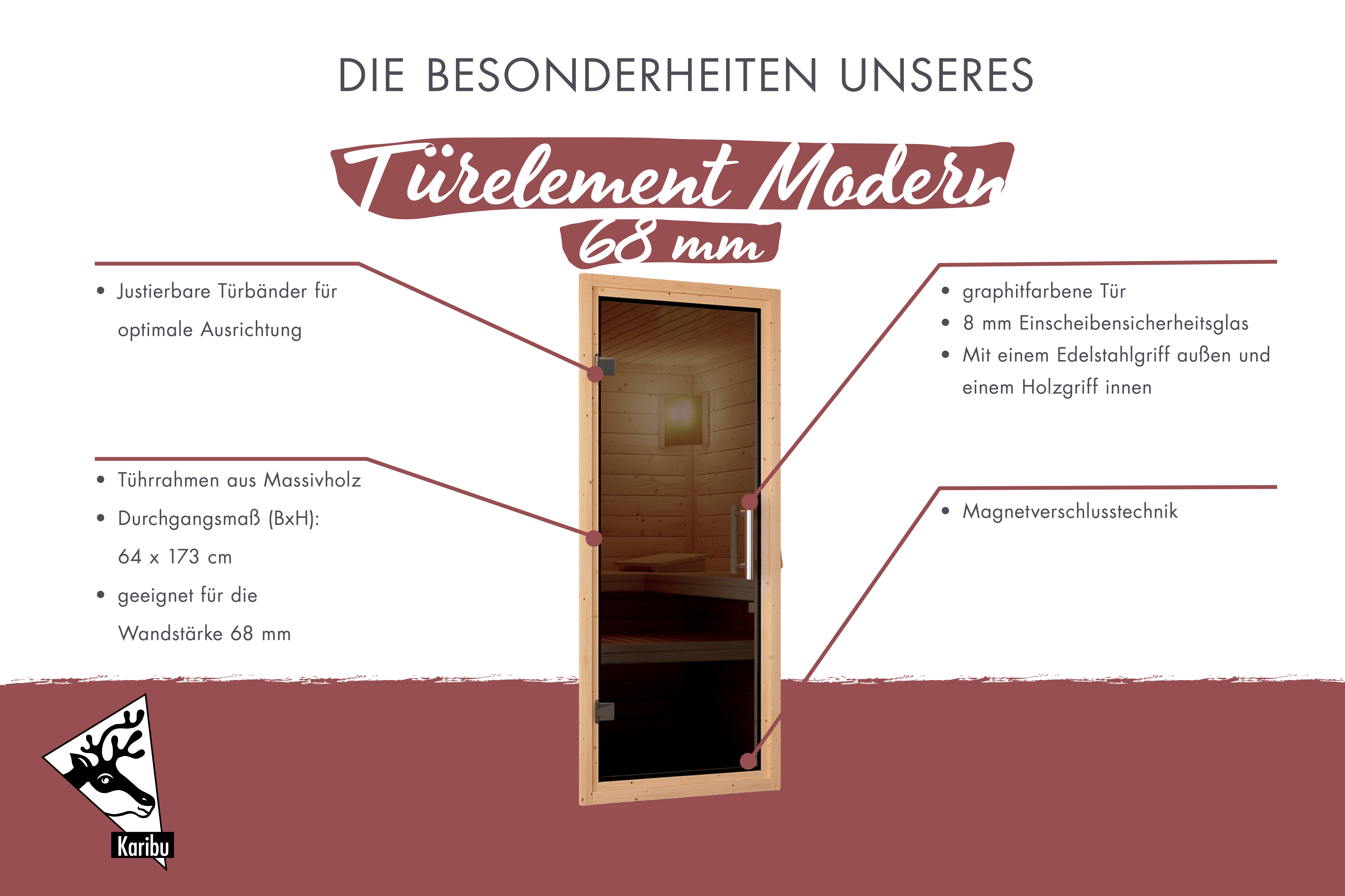 Passen Sie die Sauna an Ihre Wellness-Oase an mit dem Türelement Modern. So wird Ihre Sauna individuell und passt sich ihrer Umgebung optimal an. Die Ganzglastür besteht aus 8mm starkem, graphitfarbenem Einscheibensicherheitsglas. Gehalten wird das Glas mithilfe von Türbeschlägen in modernem anthrazit am Türrahmen aus Massivholz, die mittels Exzenter justierbar sind und das Türglas somit optimal ausgerichtet werden kann. Damit die Tür während des Saunaganges verschlossen bleibt, wird Sie von einer Magnetverschlusstechnik zugehalten. Die Tür ist sowohl links als auch rechts anschlagbar und wird mit einem exklusiven Edelstahlgriff in moderner Optik außen und einem hitzebeständigen Holzgriff innen geöffnet. Das Durchgangsmaß liegt bei (BxH) ca. 64 x 173 cm. Passen Sie die Sauna Ihrer Umgebung an mit dem Türelement Modern.