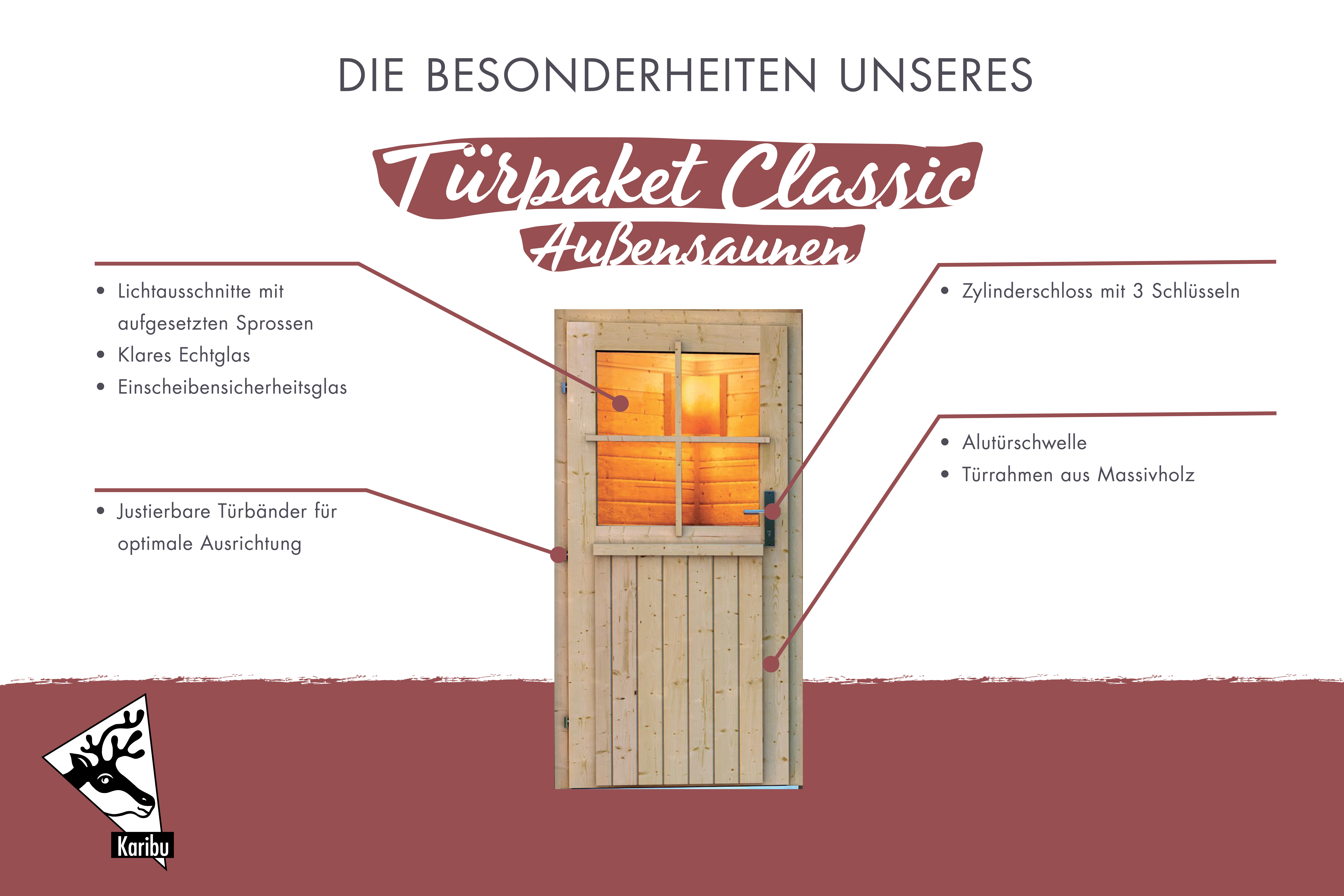 Adapt the sauna to your wellness oasis with the Classic Outdoor Sauna door package. This makes your outdoor sauna individual and adapts perfectly to its surroundings. The